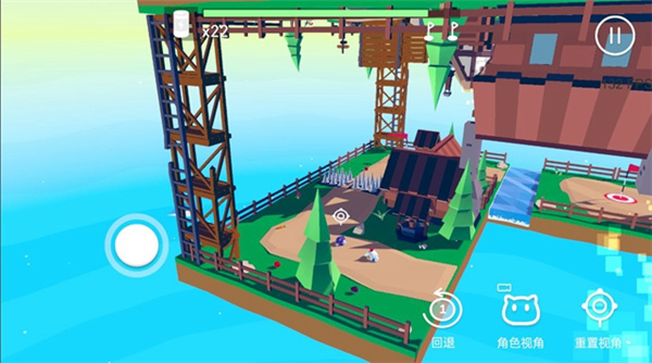 当引力方向改变后,进入重叠空间的小猫会自动落到上方平面。不过接下来的目标点却被一条河流隔开了。