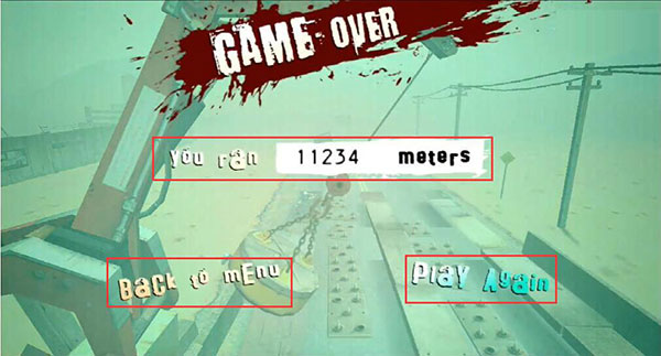 7、请一定要珍惜生命值,不管是受到僵尸攻击,还是误踩陷阱都会受到伤害,当你的生命值归零的时候,游戏即宣告结束。中间显示的是玩家的最终跑酷距离,点击左边的“BACK TO MENU”按钮会返回菜单,点击右边的“PLAY AGAIN”按钮会重新开始一局游戏。