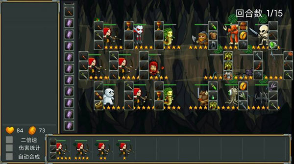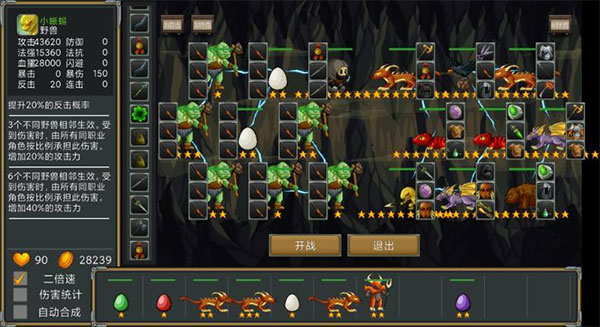 在这种思路下,前排作用主要是扛伤,扛得越稳,就能给后排创造越多的输出空间。本游目前抗伤能力比较强的是坦克,玩到后期会发现电脑多数情况也是坦克站前排。其他各种职业都可以站后排,但效果略微有些差别,总的来说弓箭、法师、亡灵效果比较好,战士穿刺追击效果略微差一些但也效果不错,总的来说各自都有优势和劣势,具体看情况选择,至于牧师,可以根据阵容情况和对方强度适当配合,在某些阵容中牧师甚至可以起到画龙点睛的作用。相对而言,野兽站后排效果比较有限,坦克站后排也不是不行,但纯坦流其实是属于后一种思路的阵容,后面会专门介绍。