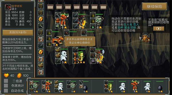 (3)铁甲将军流。这种阵容我自己没尝试过,但是推测效果应该不错。铁甲将军技能是增加场上职业个数*25%的攻击力,并且装备骑士铠甲可以提高自身15%攻击力,与地狱守卫同时上场也增加5%攻击力,可以说是当前版本技能最多的角色了。目前九种职业九个战斗位,仅此一条就额外提升225%的伤害,如果再算上地狱犬的15%攻击力,与地狱守卫共同上场的5%攻击力(这个5%有点鸡肋,换成独眼巨人加防御也是不错的),以及骑士铠甲羁绊的15%攻击力,这就有260%了,别忘了,骑士铠甲本身也加基础生命值10%的攻击力,铁甲将军的基础生命值和基础攻击力的比例是5:1恒定不变,那么这件装备相当于又增加了50%的基础攻击力,这样的话铁甲将军在只装备一件其实铠甲的情况下,攻击力就达到了原来的4倍多,相当于高两星的伤害量了,而且本身单核流集中资源养一个核心主c就不难实现星级碾压。另外,哪怕不凑9职业,凑成3战士+6其他职业也不错,这样一共7个职业,攻击加成比例也不错,而且有了溅射之后,可以做到杀死一个,打残一片,再配个追击匕首,不断收割,完全可以做到杀穿全场。