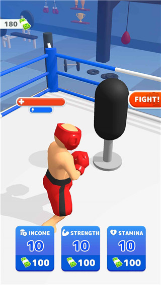 游戏的操作非常简单,不需要复杂的技巧。在训练场中不断练习,努力将沙包一拳打飞,获取金钱来购买更好的装备。然后一步步挑战更强大的专业选手,最终成为拳击王。