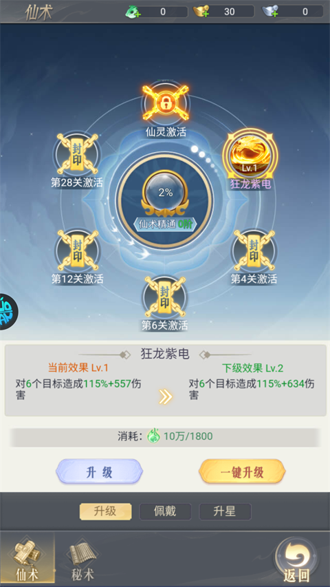 2、升级仙术提升自身的属性,从而提升战力(注意:仙术等级无法超过自身等级)