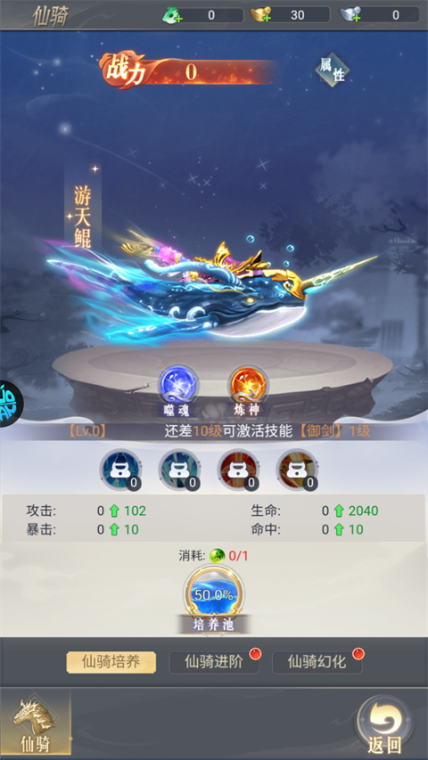 3、培养仙骑,仙骑的等级越高,攻击力提升越高(培养仙骑需要培养丹才能进行培养)