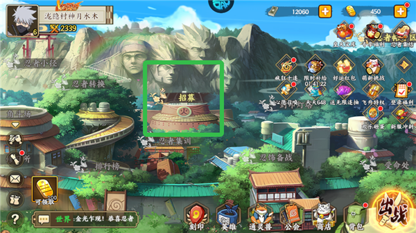 1、进入游戏主城,点击招募可前往抽取英雄卡牌。