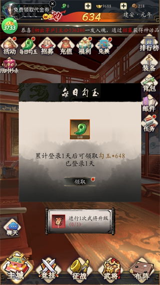 1、开局每日免费1288勾玉(勾玉可购买游戏内所有礼包),每日领取勾玉数量随登录天数增长,一直登录一直爽。