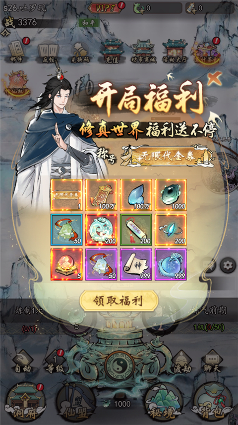 2、开局福利即送VIP8等级、专属修仙称号、战力资源、30日签到更有10W仙玉、高级时装等等赠送