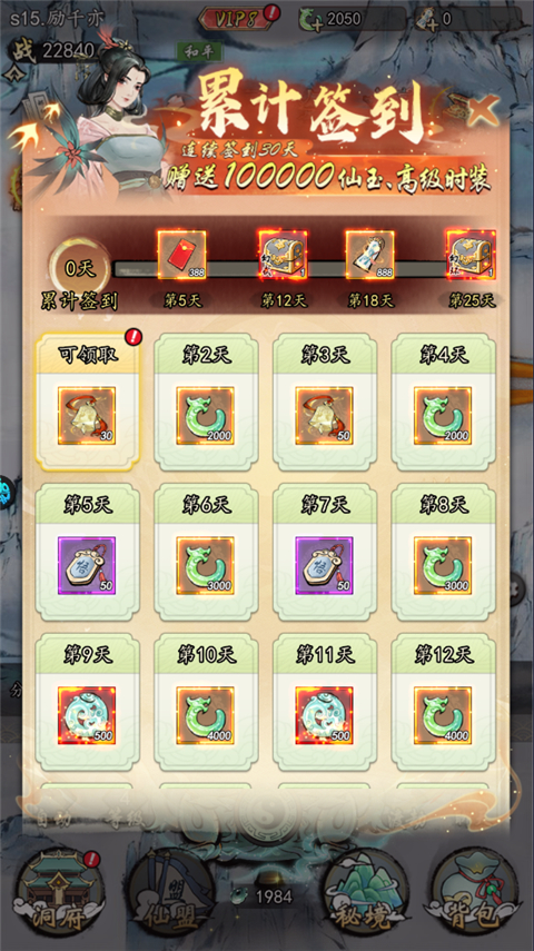 - 开局即送VIP8、专属称号、战力资源等,连续签到30天还有10万仙玉和高级时装。