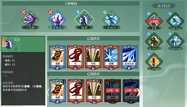 2、每种武学技能都对应着不同的招式,会在关卡对战时随机出现。