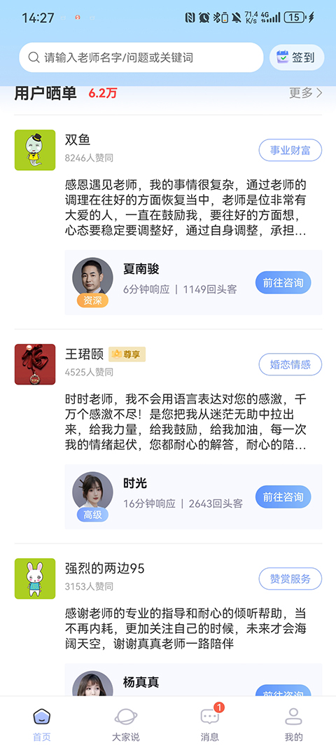 高人汇咨询是一款真人在线预测运势服务软件,涵盖心理咨询、情感分析等功能一应俱全,对于未来,提供切实的解答和方向指引。软件以古典周易、八卦文化作为主要方向,汇聚数百位知名姻缘算命大师,算命先生1对1真人在线算命服务,包括了起居风水、问事占卜、气数财运、四柱八字,八字排盘,文王八卦解在内的多个项目,全方位为用户解答疑惑。