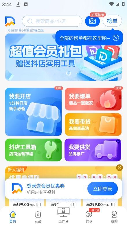 - 首页提供开店、供货、带货等多种服务,并实时推荐热门商品。