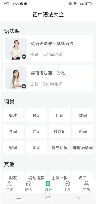 - 教材部分:包含所有初中的单词和课文,有同步翻译和真人发音。还有详细的语法讲解、配套练习以及离线词典功能。