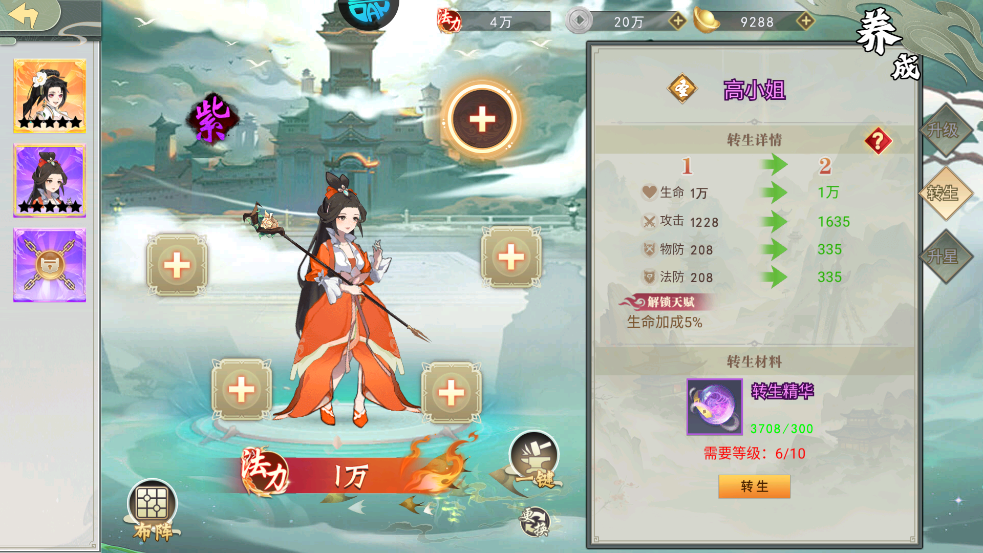 4、玩家还可以对阵容中的神将进行培养,包括一键穿戴装备、再通过升级、转生和锻造来提升神将战力