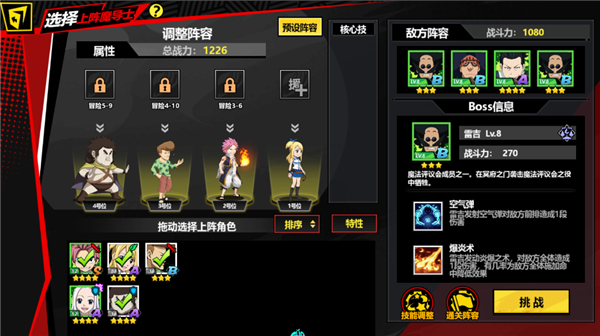 点击冒险之旅妖精的尾巴手游还原了大量经典剧情,玩家通过挑战相应章节后即可观看漫画CG,还可以收集拉克萨斯·朵勒阿、纳兹·多拉格尼尔、露西·哈特菲利亚、艾露莎·舒卡勒托、格雷·佛尔帕斯塔等角色,每一位角色拥有着独特的属性以及技能,合理搭配可以形成多种体系阵容玩法。除了冒险玩法外,游戏还内置精英篇章、大魔王武演、委托、挑战、工会、梦境冒险等玩法模式!