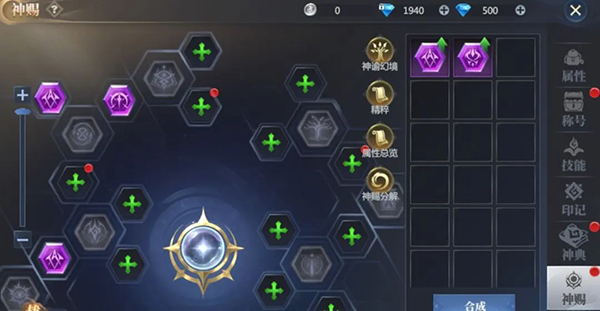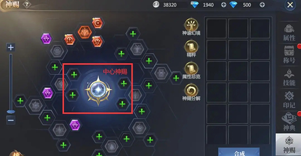 2、神赐装备:分为外圈神赐和中心神赐,每种神赐仅可装备在对应的神赐孔位上。