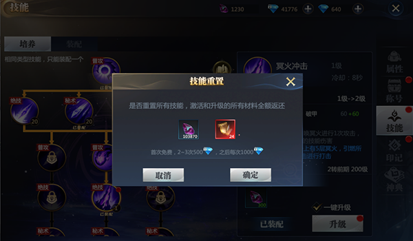 4、技能学习后可以通过消耗绑定钻石以及钻石进行重置,100%返还已学习技能时消耗的秘能精华以及技能残卷。