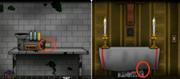 进入实验室后,根据旁边信封里的提示打开机器,放进去鱼后会得到纸条。再到十字架处,在桌布下面可以找到银色的十字架。