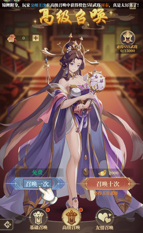 1、玩家进入游戏后可以先使用免费的召唤券,召唤一个强力的武将英雄,让他和你一起作战。