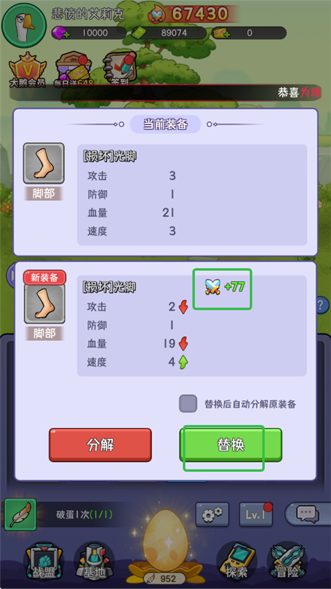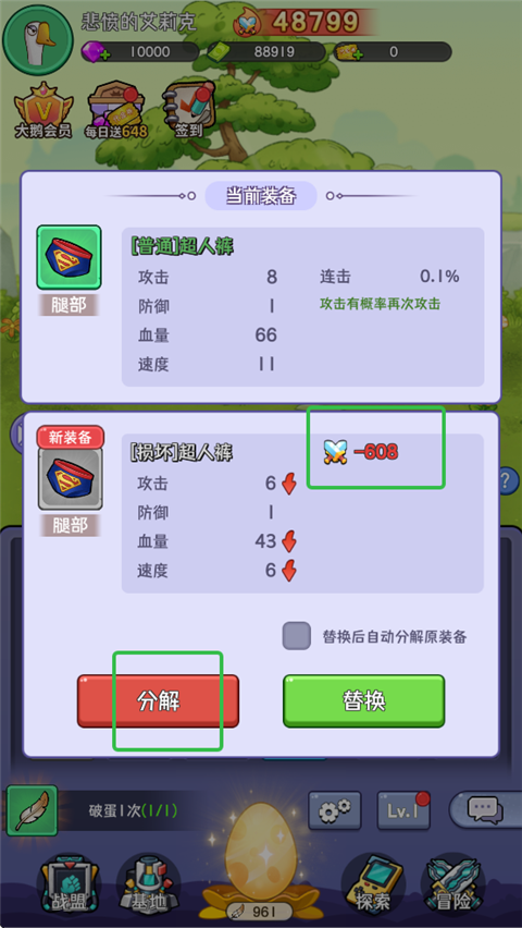 3、新装备战力更低,是低阶装备,点击分解,不替换。