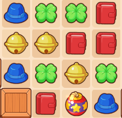 2、交换棋子,将颜色相应的棋子交换到一排或者一列,配对相同的棋子消除木箱。