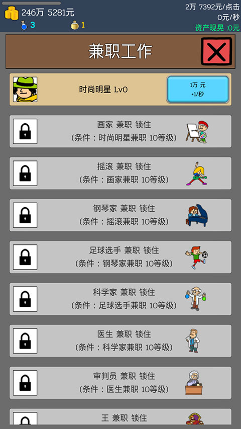 - 可以雇用各种奇特的人来帮忙赚钱,比如时尚达人、小丑、画家等。