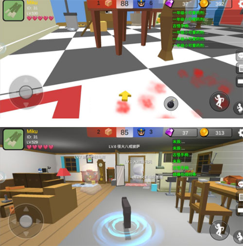 除了基础玩法,游戏还加入了丰富的特色功能。寻找者可以使用各种道具辅助战斗,比如加血道具能在关键时刻补血;指向标能帮助定位目标;手枪和手雷等武器则让战斗更具策略性。躲避者可以通过释放烟雾弹迷惑对手,或者利用特殊效果增加趣味性。