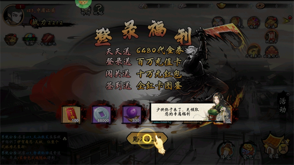 游戏玩法: 进入游戏后,首先创建一个角色。登录游戏就能领取每天的6480代金券福利。在前期建议先完成主线任务,体验闯荡江湖的乐趣。选择好上阵的角色后点击挑战按钮,开始战斗。游戏中角色会自动进行战斗,击败敌人后即可获得奖励。记得提升角色等级,以便后续挑战更难的关卡。