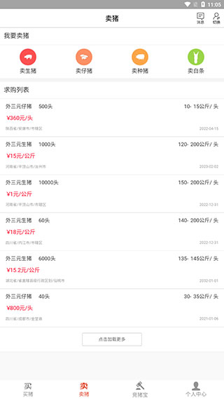 2、如果是养殖户,就可以到【卖猪】页面查看求购列表,售卖还分为卖生猪、卖仔猪、卖种猪、卖白条这四种类别。