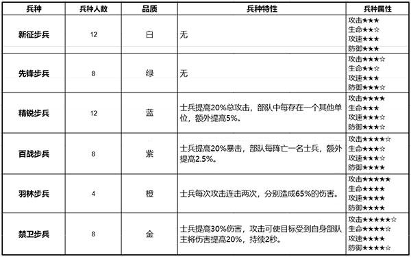 盾兵的生命值普遍偏高,很多盾兵可以在主将阵亡后继续帮助后排扛伤。从百战盾兵开始普通兵种和特殊兵种的士兵属性是差不多的,但特性上还是有差距。(所有的普通兵种都可以在黄巾之战活动中获取)