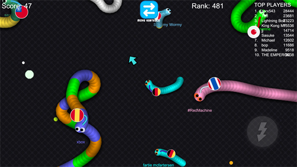 游戏规则和火爆的球球大作战有些相似。地图广阔,可以容纳上百条蛇。玩家不用担心会碰到墙,但要提防其他玩家的攻击。如果你的小蛇碰到了别人的蛇身体,就会碎成能量块。