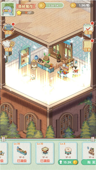 游戏中,你需要自己采购各种食材和家具,并为客人准备美食。当你看到客人头上显示想吃的菜品时,点击它就能让后厨开始制作。食物做好后会自动端给客人,整个过程非常简单又有趣。