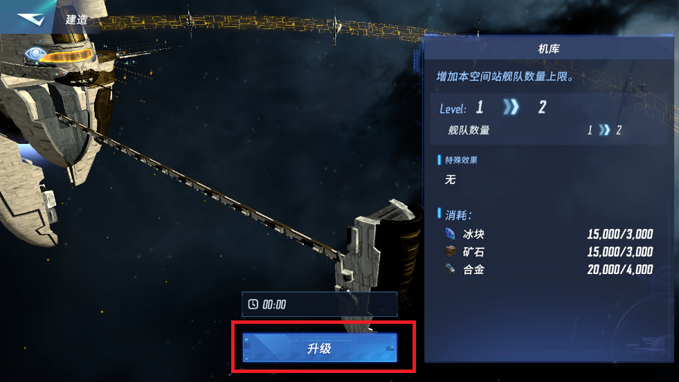4、首先先升级机库,后期玩家可以自由选择建造哪个建筑。消耗资源升级机库。