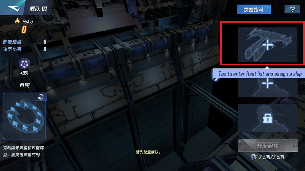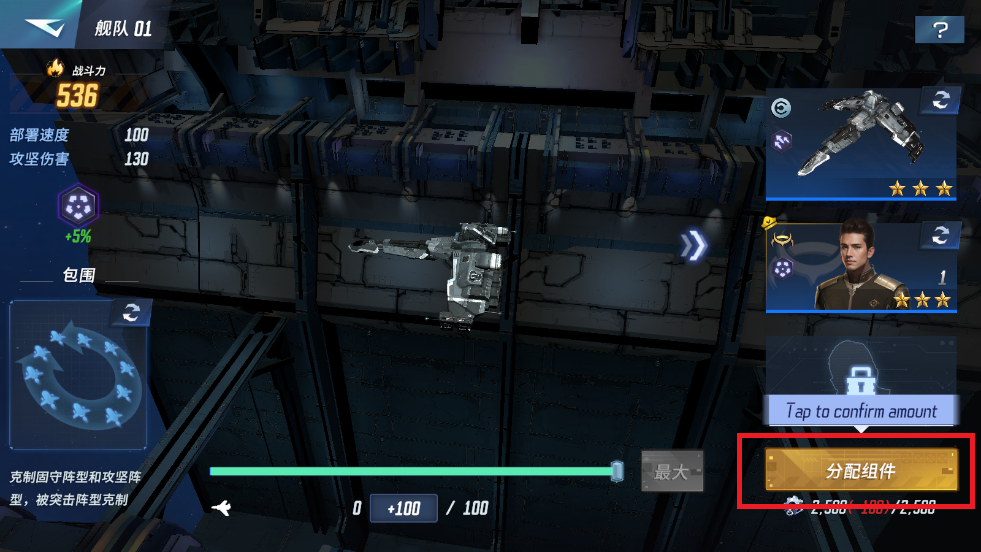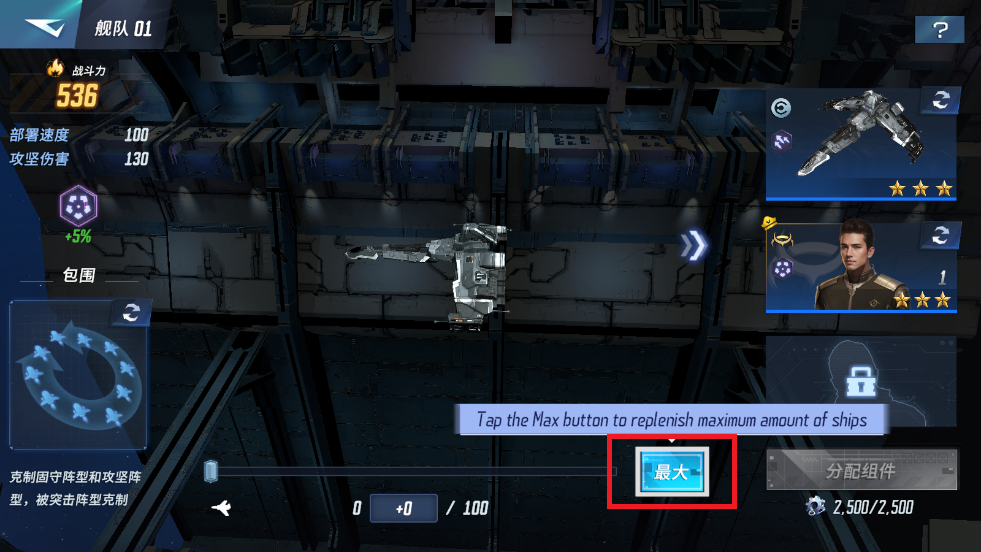 9、配置好战舰和指挥官后,我们需要补充战舰。点击底下的最大选项,点击分配组件。