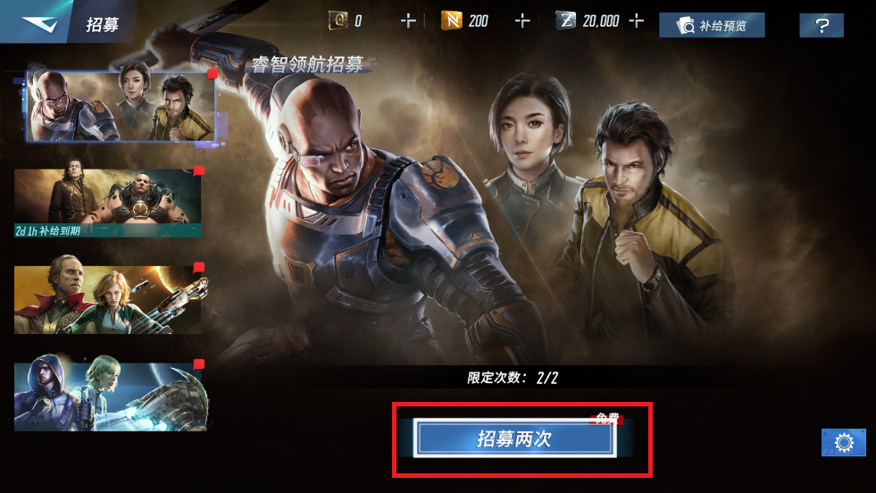 5、打造舰队需要招募指挥官和获得战舰蓝图。点击招募,选择招募两次。