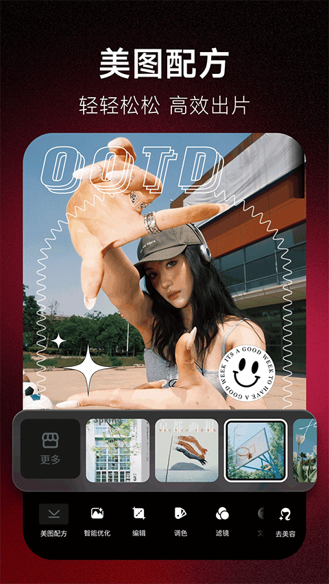 【全能修图】简单便捷无需切换,满足各种修图需求。美图配方汇聚流行图片视频玩法。专业滤镜调色工具,应对不同场景。