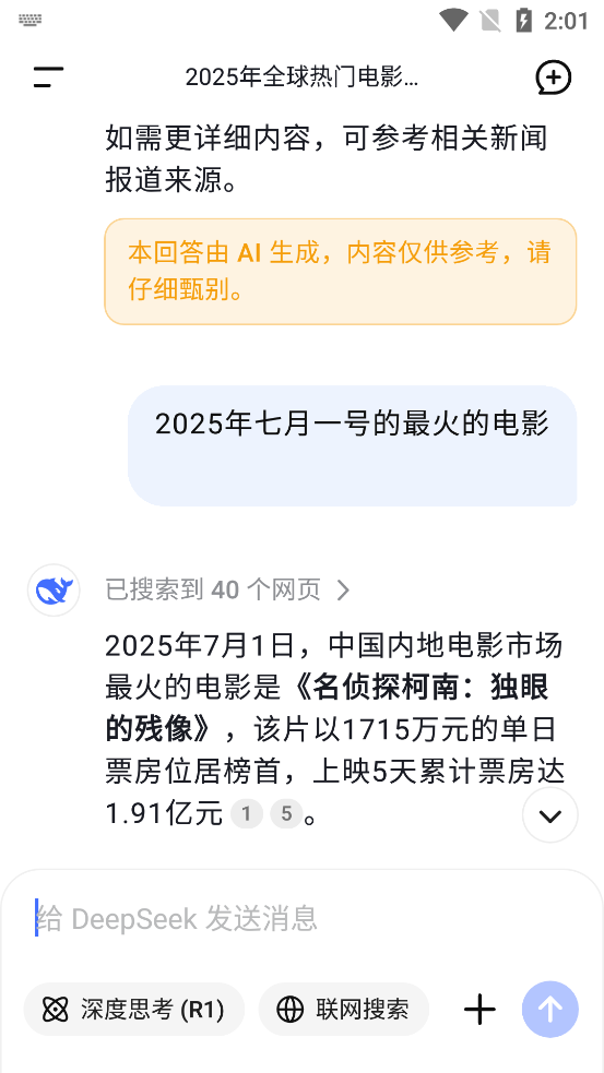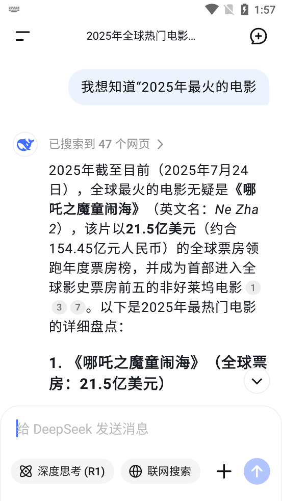 1、打开DeepSeek App,在搜索框里输入我们想找的内容,就比如我想知道“2025年最火的电影”,直接输入再搜索,果然是《哪吒之魔童闹海》。就是在搜索之前我们要先想清楚要找什么,如果直接搜“电影”,太广泛了结果肯定不准确。
