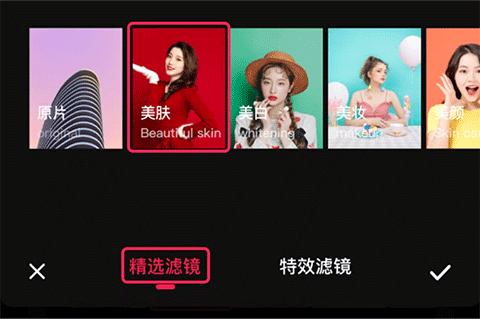 2、「精选滤镜」是静态滤镜「特效滤镜」动态滤镜,并且每个滤镜都可以“点击调节”~调整滤镜值0~100的值的调整,并且可以把您喜欢的滤镜“应用到全部视频”。