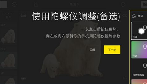 常规即是用手指滑动控制各项参数。许多修图工具都是如此,例如 Snapseed、Enlight。备选则是使用陀螺仪控制参数,长按色块,左倾或右倾手机改变数值。这点确实让人耳目一新,原来手机上还可以这样修图 !
