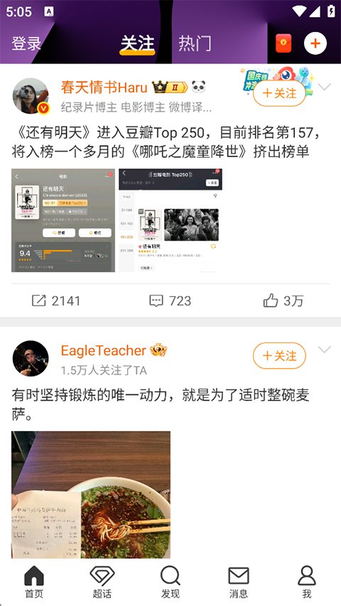 微博内容丰富多样,涵盖体育、电影、财经等各个方面,满足不同用户的兴趣需求。平台还提供了热搜榜、明星动态、超话社区等功能,让用户可以轻松找到感兴趣的话题并与他人互动。此外,微博的推荐系统能根据用户喜好推送相关内容,提升使用体验。