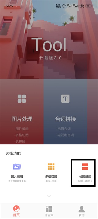 1、打开Picsew长拼图App,点击你需要的功能【图片处理、台词拼接、海报制作、网页截图】