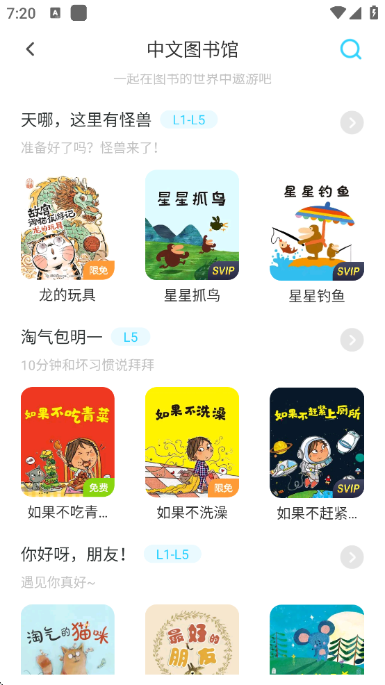 海量国外原版绘本免费阅读;根据权威分级阅读体系分级,各个年龄阶段的孩子都能轻松找到适合自己的绘本。