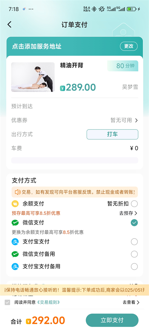 3、输入地址,点击立即支付,随后等待上门服务即可