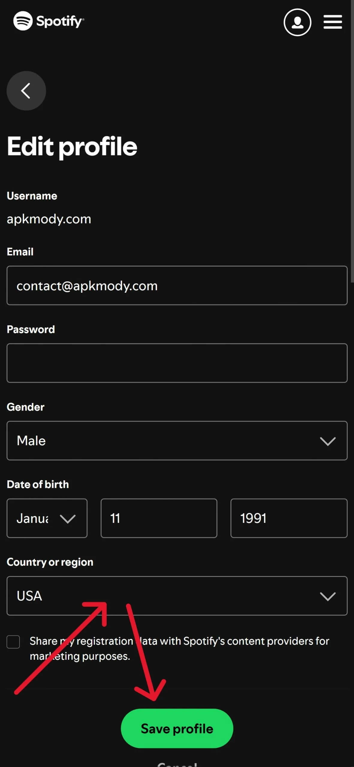 浏览器访问 https://www.spotify.com/us/account/profile/,登录到你的站点帐户,并改变你的区域到美国或国家的加速器。