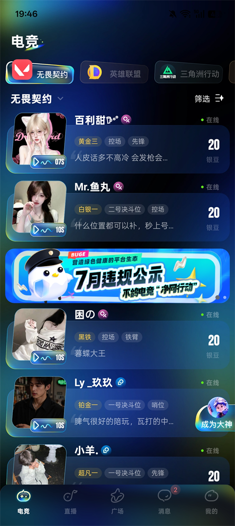 App里有试音验实力的功能,这样能找到声音好听技术好的队友,听起来挺靠谱的。还有双模式切换看直播,这点对喜欢看比赛或者直播的人来说很实用。特别是能追踪《英雄联盟》和《王者荣耀》这样的热门赛事,参与讨论还能结交更多朋友,感觉互动性很强。