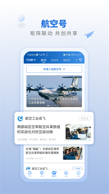航空强国客户端是中国航空工业集团新型主流媒体的旗舰媒体,致力于打造成为中国航空业具有较强公信力和影响力的权威新闻门户、移动传播枢纽,立足航空、面向社会的主流舆论引擎、聚合服务平台。客户端以集成发布航空业内新闻资讯为基础,聚合多层次资源和多样性服务,与行业从业者和社会公众开展多维互动,逐步发展成为具有优质内容和良好用户体验,拥有较强传播力和引导力,助力新时代航空强国建设的新型主流媒体。