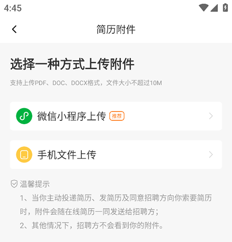 2、您可以通过填写在线简历或滑动到下方点击上传简历附件;