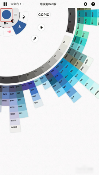 3、进入到创建的画板页面,点击左上角的蓝色小圆圈是选择颜色