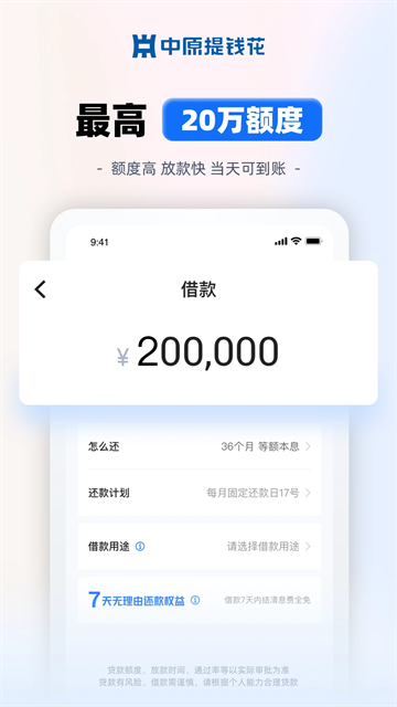 中原提钱花App是由柚卡升级而来的一款消费分期借贷工具,背后有中原银行支持,资质正规安全靠谱。它提供大额消费信贷服务,额度最高可达20万,支持线上申请和客户经理上门办理,提现到银行卡或绑定微信支付都很方便。最棒的是不收取任何申请费、手续费,利息按日计算,分期还款灵活透明。