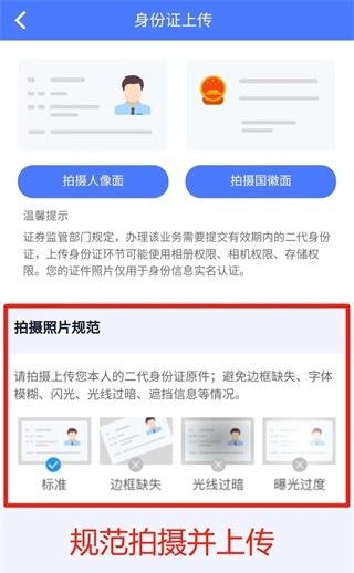 4、上传身份证人像面、国徽面,注意规范拍摄,不切边、不遮挡,字迹清晰