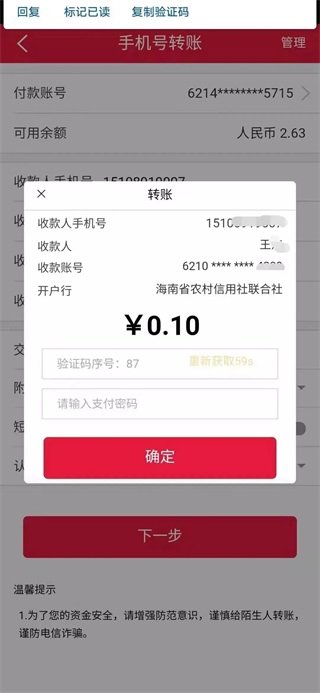 2.输入金额点击【下一步】,验证支付密码等要素即可完成