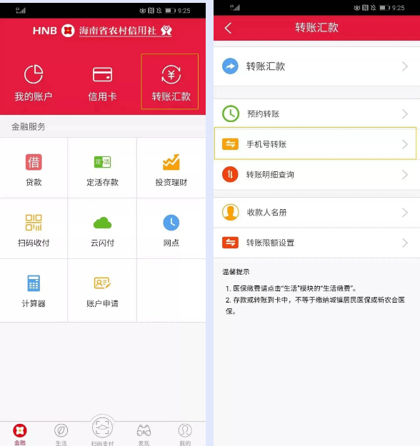 一个手机号码可和多家金融机构的账户注册绑定,在每家金融机构只可以和一个账户注册绑定。注册的手机号码默认为海南农信社绑定个人手机银行的预留手机号,如向收款人发起手机号转账,收款人必须注册手机号转账。开通“手机号码转账”功能的账户,应满足账户实际交易发生。